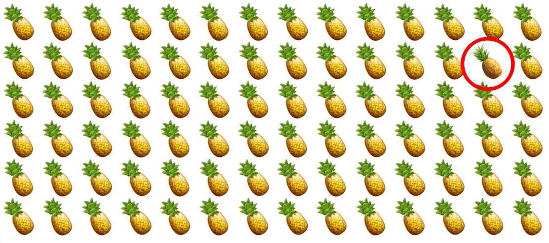 In de afbeelding zie je veel ananassen in verschillende rijen. Het is jouw taak om een speciale ananas te vinden die anders is dan alle andere.