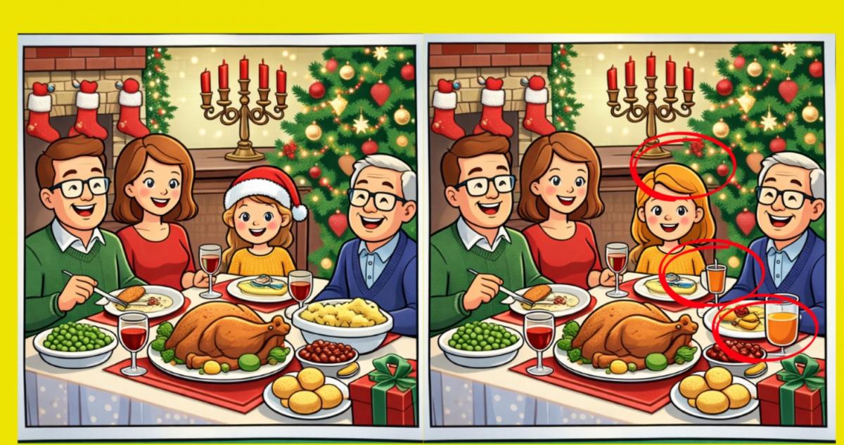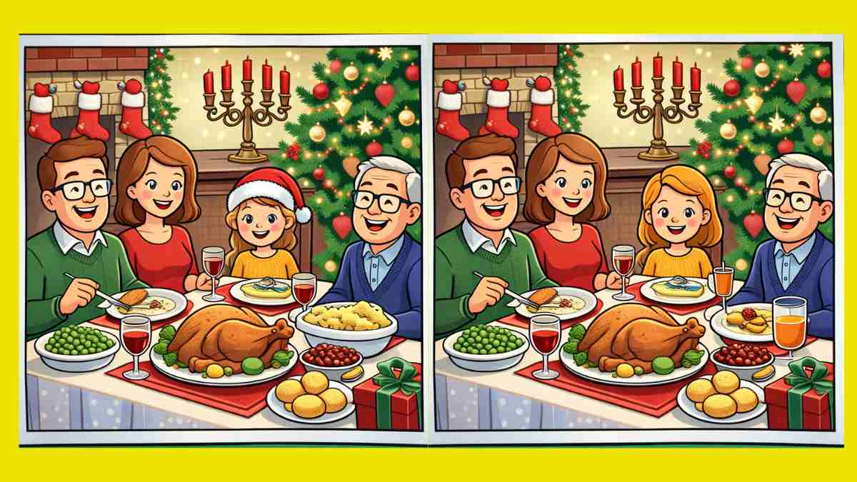 Ben je klaar voor de volgende uitdaging? Kijk eens goed naar twee afbeeldingen van een kerstdiner met de familie. Op het eerste gezicht zien ze er misschien hetzelfde uit, maar er zitten 3 kleine verschillen in verborgen. Denk je dat je ze allemaal kunt vinden in 16 seconden? Probeer het en test je gezichtsscherpte!