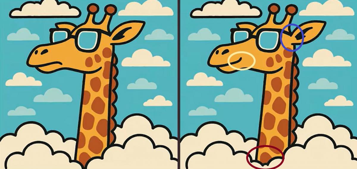 Ben je klaar voor de volgende uitdaging? Bekijk de twee afbeeldingen van de giraffe met de bril eens goed. Op het eerste gezicht zien ze er misschien hetzelfde uit, maar er zijn 3 kleine verschillen. Denk je dat je ze allemaal kunt vinden in 23 seconden? Probeer het en test je gezichtsvermogen!