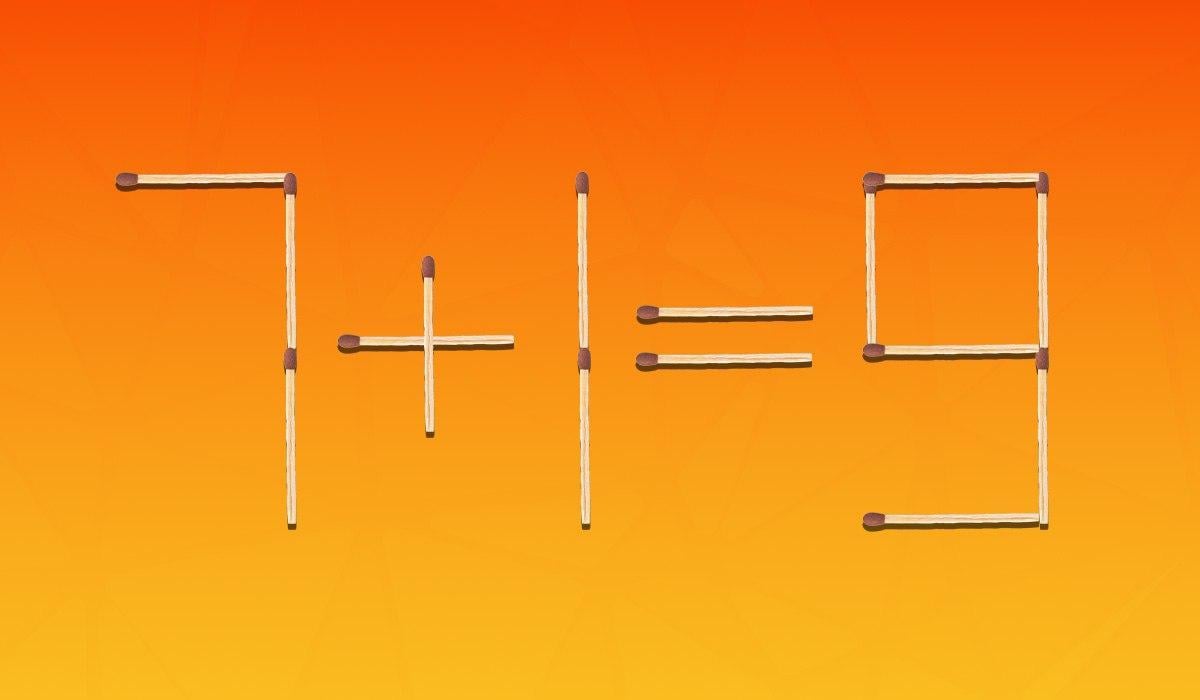 Hieronder zie je een afbeelding waarin de gelijkheid 7+1=9 met lucifers is gelegd. Het is duidelijk dat dit wiskundig onjuist is en je moet dit corrigeren door slechts twee lucifers van de 15 te verplaatsen.