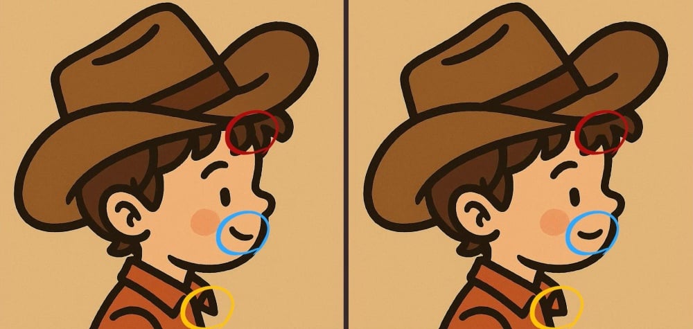 Ben je klaar voor de volgende uitdaging? Kijk eens goed naar twee afbeeldingen van een jongen met een cowboyhoed op. Op het eerste gezicht zien ze er misschien hetzelfde uit, maar er zijn 3 kleine verschillen. Denk je dat je ze allemaal kunt vinden in 51 seconden? Probeer het en test je gezichtsvermogen!