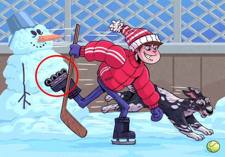 Op de foto zien we een jongen schaatsen op het ijs en een hond die naast de jongen loopt. Op het eerste gezicht lijkt het alsof er geen fout in de foto zit, maar dat is niet zo. Als je goed kijkt, zie je dat sommige dingen verkeerd zijn getekend.