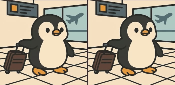Ben je klaar voor de volgende uitdaging? Bekijk twee afbeeldingen van een schattige pinguïn die bagage draagt op het vliegveld. Op het eerste gezicht lijken ze identiek, maar er zitten 3 kleine verschillen in verborgen. Denk je dat je ze allemaal kunt vinden in 61 seconden? Probeer het en test je visuele scherpte!