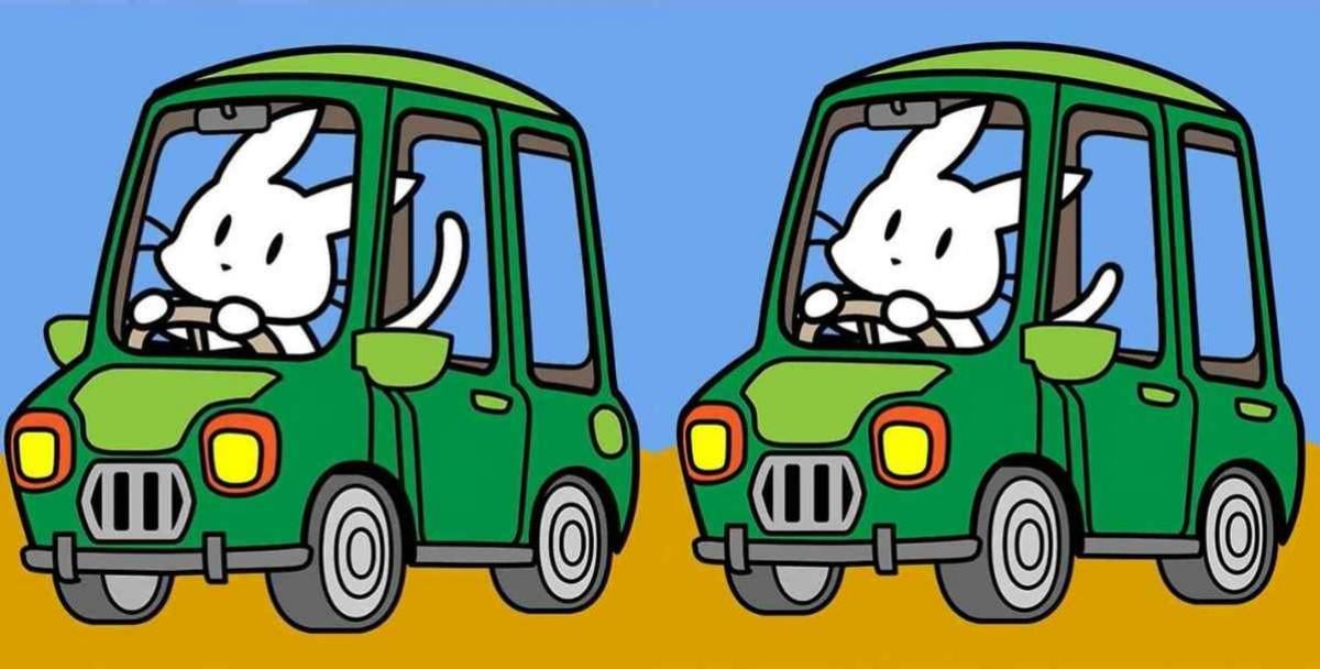 Probeer een leuke, maar niet de makkelijkste puzzel op te lossen – je moet verschillende verschillen vinden in twee afbeeldingen van een konijn dat in een auto rijdt.
