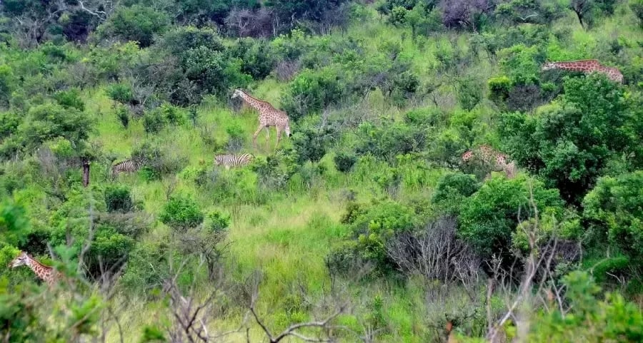 We zien een groep dieren tussen groene bomen en struiken lopen. Er staan een bepaald aantal giraffen en zebra’s op de foto. Maar het exacte aantal tellen is niet eenvoudig. Sommige dieren zijn immers duidelijk zichtbaar, maar tegelijkertijd kunnen sommige voor onze ogen verborgen zijn.