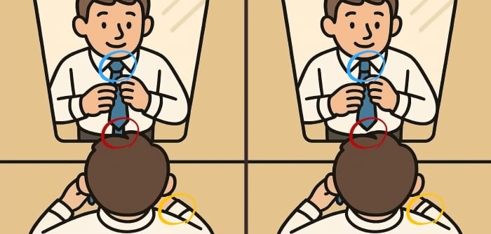 Ben je klaar voor de volgende uitdaging? Kijk eens goed naar twee afbeeldingen van een man die een stropdas knoopt. Op het eerste gezicht lijken ze identiek, maar er zijn 3 kleine verschillen. Denk je dat je ze allemaal kunt vinden in 45 seconden? Probeer het en test je visuele scherpte!