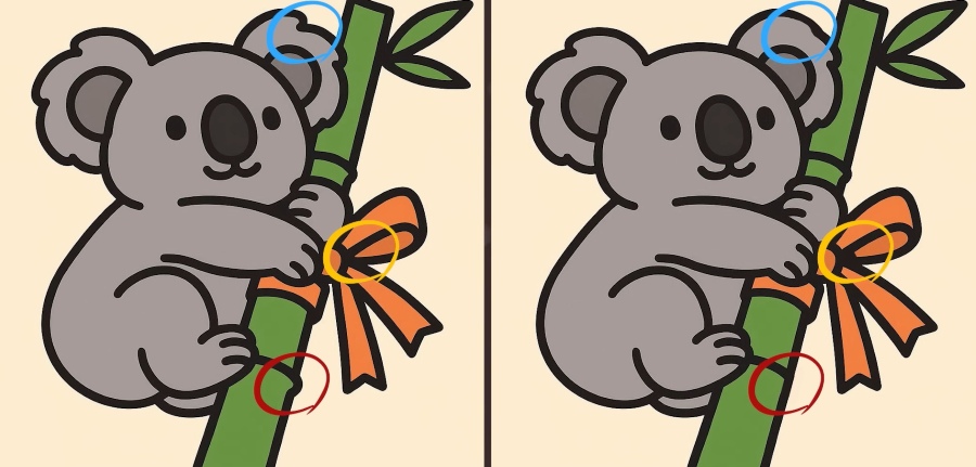 Ben je klaar voor de volgende uitdaging? Kijk eens goed naar de twee afbeeldingen van een koala die bamboe knuffelt. Op het eerste gezicht zien ze er misschien hetzelfde uit, maar er zijn 3 kleine verschillen. Denk je dat je ze allemaal kunt vinden in 33 seconden? Probeer het en test je gezichtsvermogen!