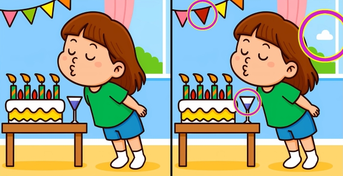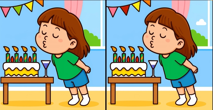Ben je klaar voor de volgende uitdaging? Kijk eens goed naar de twee afbeeldingen van het meisje dat de kaarsjes op de taart uitblaast. Op het eerste gezicht zien ze er misschien hetzelfde uit, maar er zijn 3 kleine verschillen. Denk je dat je ze allemaal kunt vinden in 31 seconden? Probeer het en test je gezichtsvermogen!