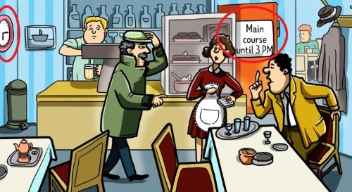 Een detective ging een restaurant binnen en merkte een hevige ruzie op tussen een licht beschonken man en een serveerster. De serveerster hield vol dat de klant van het etablissement ook vlees had besteld en eiste van hem dat hij zou betalen voor het eten dat hij had besteld. Tegelijkertijd beweerde de man dat hij naar het etablissement was gekomen om de tijd te doden en geld probeerde te besparen, dus had hij geen vlees besteld.